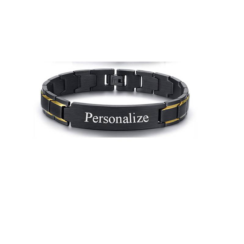 Custom Engraving Heavy Chain Bracelet 12mm Men's Black Matt Finish Curved Bar Charm Bracelet in Stainless Steel